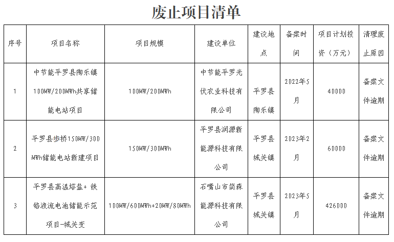 石嘴山市平羅縣審批服務(wù)管理局關(guān)于廢止一批新型儲能項(xiàng)目的公告