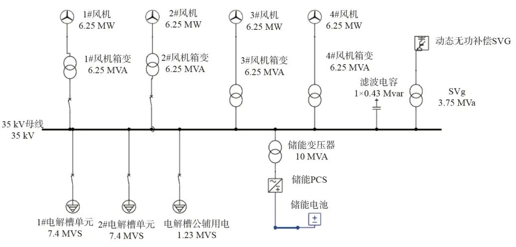 如下圖所示,新能源發(fā)電側包含4臺風機,4臺風機通過風機箱式變壓器升壓后連接35千伏母線。共1個儲能電池模塊,儲能電池模塊出口側連接PLC(雙向逆變器)入口側,PLC(雙向逆變器)出口側連接儲能變壓器低壓側,儲能變壓器高壓側連接35千伏母線。共2個電解槽模塊,及1個公輔供電模塊,電解槽和公輔模塊連接35千伏母線,電解槽模塊為包含整流器、整流變壓器的交流負載模塊。