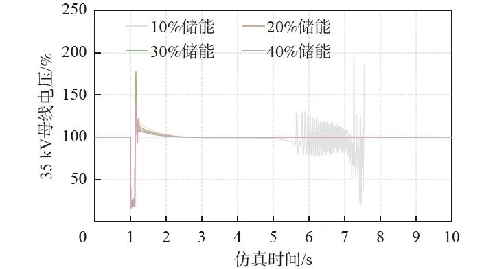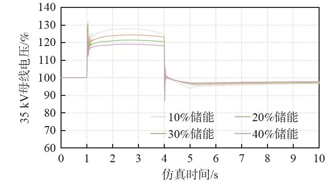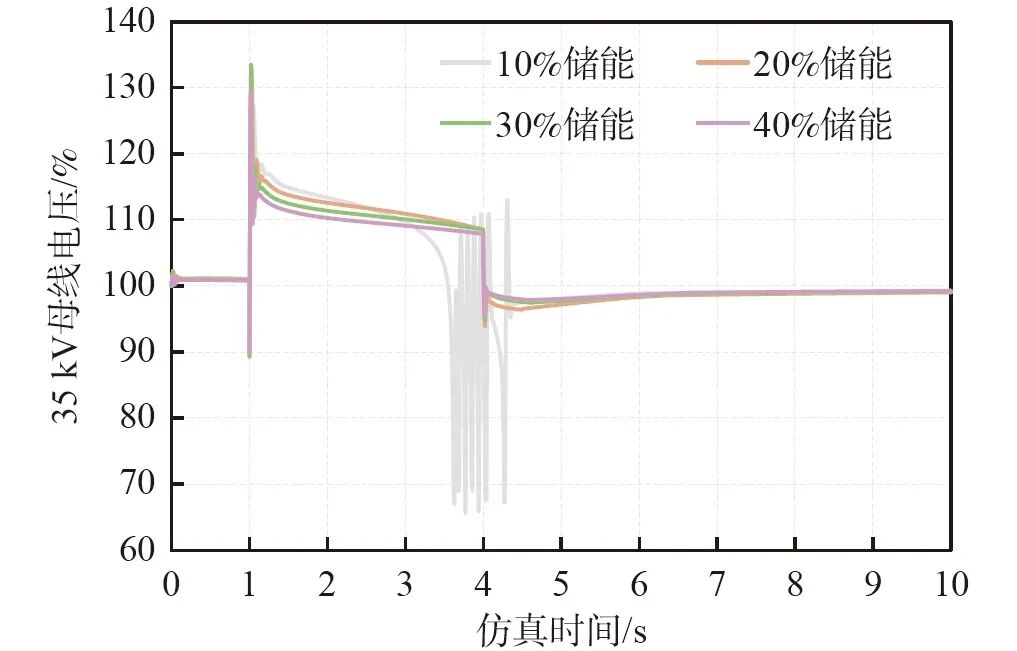 下圖為仿真工況(3)35千伏母線電壓在不同儲能配比情況下的仿真結果。風機高壓側母線單相故障在排除前帶來了很大的電壓波動,小于20%儲能的情況下無法使得系統(tǒng)電壓穩(wěn)定,系統(tǒng)電壓在故障排除后產(chǎn)生了震蕩現(xiàn)象,儲能組件無法通過無功功率調(diào)節(jié)平抑波動。20%及以上的儲能配置可以平穩(wěn)電壓,區(qū)別在于在故障排除后導致的電壓波動峰值。