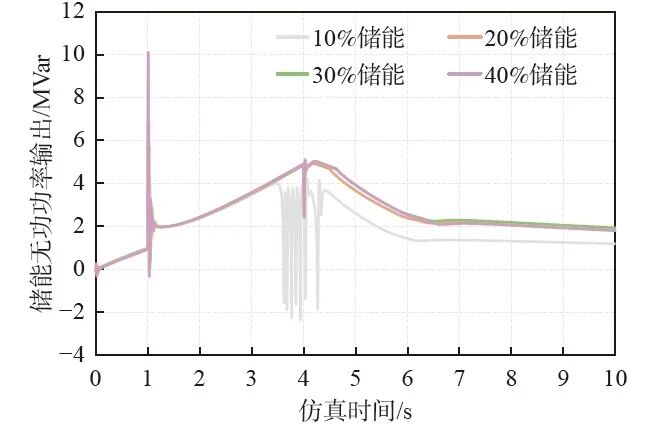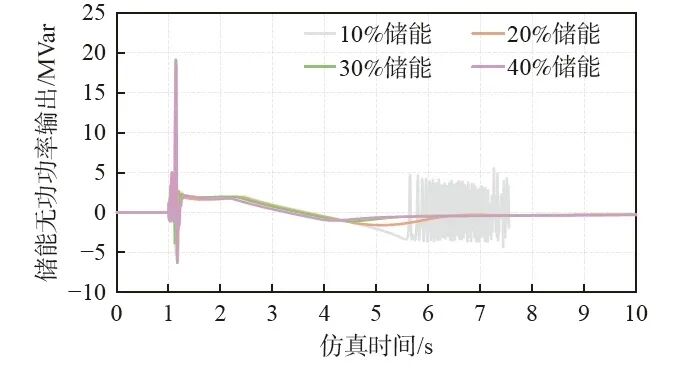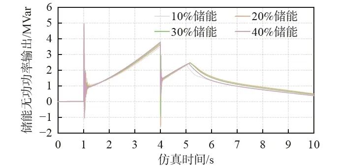 如圖1所示,與工況(1)情況近似,當負荷端變化時,系統(tǒng)電壓發(fā)生短暫過載并在發(fā)電端調(diào)節(jié)后趨于穩(wěn)定。除40%儲能外,在發(fā)電端完成調(diào)節(jié)之前,電壓過載率均高于20%。如圖2所示,與工況(1)相比,儲能無功輸出更低。