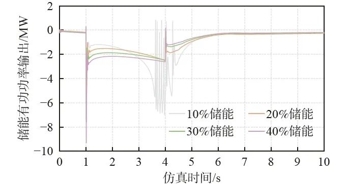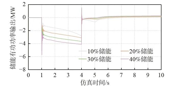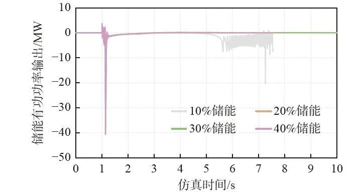 儲能組件的有功功率輸出如下圖所示,更大的儲能配比可提供更高的有功功率輸出,并可以有效減少頻率的波動峰值。