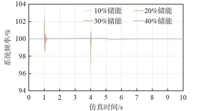 下圖表明,20%以上儲能情況下,系統(tǒng)頻率波動不明顯,在系統(tǒng)完成調(diào)節(jié)后頻率穩(wěn)定,變化范圍<1%。