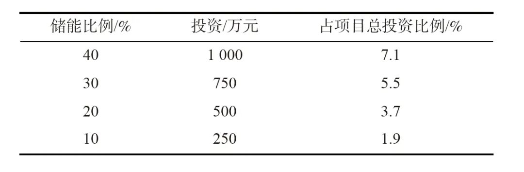 本文中所設計項目主要包含2臺1500Nm3/h的堿性電解槽,制氫工程部分按300萬元/兆瓦計算,制氫部分投資金額約4500萬元。風電部分包含4臺額定功率在6.25兆瓦的風機,投資金額約為8500萬元。儲能部分按1元/瓦時計算,投資估算見下表,每增加10%儲能對應增加投資占比約1.6個百分點。