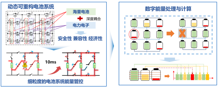動態(tài)可重構電池儲能技術(DRBN-BEST)作為一種信息-能源前沿交叉領域變革性技術,其核心思想是將互聯(lián)網(wǎng)屏蔽終端差異性的技術體系引入大規(guī)模電池儲能領域。通過對模擬連續(xù)電池單體/模組能量流的離散化數(shù)字化處理與管控,將電池固定串并聯(lián)的連接方式改變?yōu)檐浖刂频膭討B(tài)重構連接,從根本上消除了“電池系統(tǒng)短板效應”,極大提升了電池系統(tǒng)的安全性、可靠性、壽命和效率。DRBN-BEST具備毫秒級電池網(wǎng)絡拓撲動態(tài)重構、微秒級故障單體/模組的快速檢測與隔離能力,可支持多種異構儲能介質的數(shù)字化混用,可實現(xiàn)退役動力電池車上車下無縫銜接的數(shù)字無損梯次利用,是能源互聯(lián)網(wǎng)領域的顛覆性技術。相比固定串并聯(lián)電池管理(BMS)技術,DRBN-BSET具有高安全、高可靠、低成本、長壽命等優(yōu)勢,應用證明可延長系統(tǒng)壽命達100%,單次充放電過程提升系統(tǒng)可用容量達15%以上、直流側能量效率達95%以上。