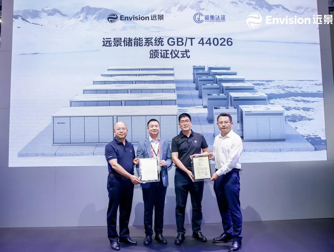 中國儲能網(wǎng)訊:近日,鑒衡認證中心向遠景頒發(fā)了GB/T 44026-2024《預制艙式鋰離子電池儲能系統(tǒng)技術規(guī)范》直流儲能艙新國標認證證書。遠景能源高級副總裁黃志勇、遠景儲能產(chǎn)品研發(fā)專家李衛(wèi),鑒衡認證中心副主任陳雪松、儲能事業(yè)部銷售總監(jiān)王德科共同出席頒證儀式,見證這一重要時刻。