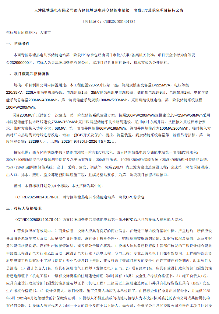 中國(guó)儲(chǔ)能網(wǎng)訊:8月30日,天津陳塘熱電有限公司西青區(qū)陳塘熱電共享儲(chǔ)能電站第一階段EPC總承包項(xiàng)目招標(biāo)公告發(fā)布。項(xiàng)目招標(biāo)人為天津能源投資集團(tuán)旗下的天津陳塘熱電有限公司,項(xiàng)目電化學(xué)儲(chǔ)能系統(tǒng)總?cè)萘?00MW/400MWh,第一階段儲(chǔ)能系統(tǒng)規(guī)模100MW/200MWh,采用磷酸鐵鋰電池,第二階段儲(chǔ)能系統(tǒng)規(guī)模100MW/200MWh。本次招標(biāo)范圍為第一階段EPC總承包。