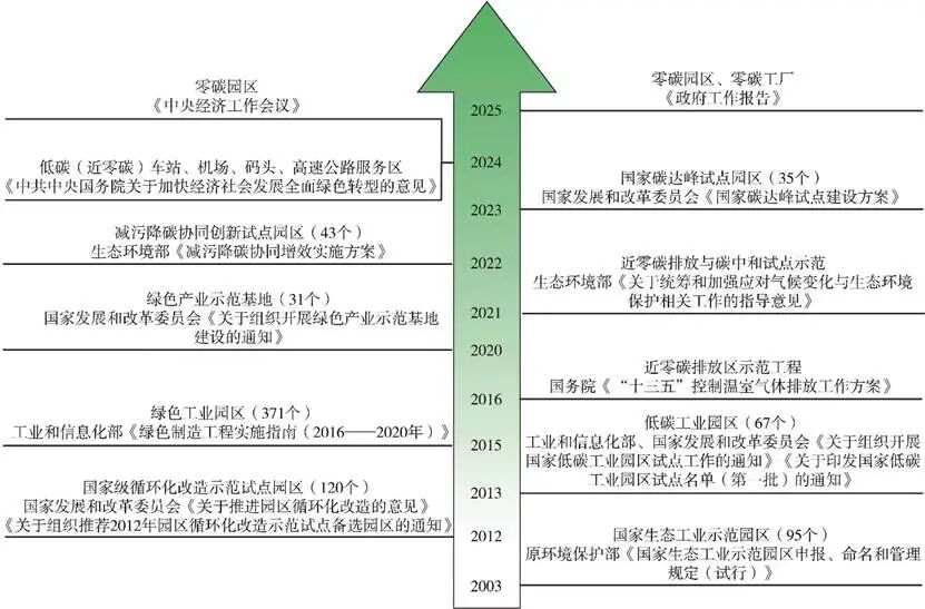 在政策層面,園區(qū)零碳發(fā)展政策經(jīng)歷了從“早期探索—孕育發(fā)展—全面深化”的階段性演進(jìn)過程(圖1)。在早期探索階段,國家相關(guān)部委主要從某個角度或者領(lǐng)域出發(fā),先后推進(jìn)生態(tài)工業(yè)示范園區(qū)、循環(huán)化改造示范園區(qū)、低碳工業(yè)園區(qū)、綠色工業(yè)園區(qū)和綠色產(chǎn)業(yè)示范基地等多類試點項目。其中,生態(tài)工業(yè)園區(qū)與循環(huán)化改造園區(qū)以循環(huán)經(jīng)濟(jì)理念推動產(chǎn)業(yè)鏈綠色改造,低碳工業(yè)園區(qū)聚焦重點用能行業(yè)的低碳轉(zhuǎn)型,而綠色工業(yè)園區(qū)和綠色產(chǎn)業(yè)示范基地則突出綠色制造理念。這些試點在生態(tài)保護(hù)、資源循環(huán)利用、低碳轉(zhuǎn)型、綠色制造等方面積累了經(jīng)驗,為后續(xù)推進(jìn)系統(tǒng)性治理奠定了重要基礎(chǔ)。