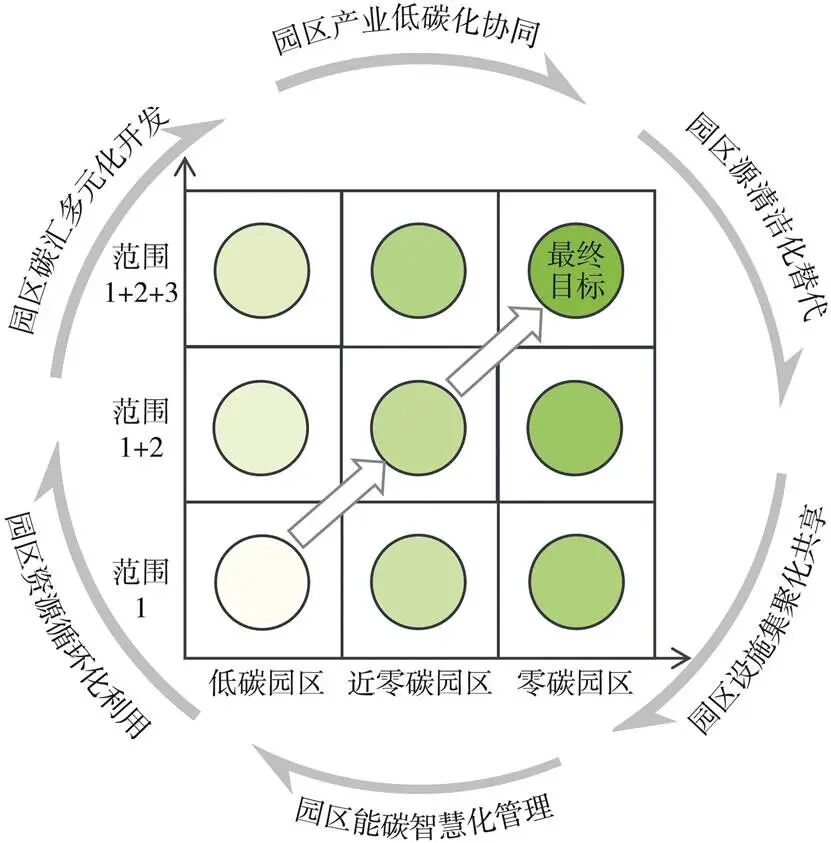 零碳園區(qū)建設(shè)通常經(jīng)歷三個階段:低碳園區(qū)、近零碳園區(qū)和零碳園區(qū)。低碳園區(qū)是碳減排的初始階段,通過建立循環(huán)經(jīng)濟(jì)模式,提升園區(qū)內(nèi)資源利用效率,減少廢物排放,構(gòu)建“低碳、清潔、和諧”的產(chǎn)業(yè)環(huán)境,其目標(biāo)是盡可能降低碳排放但并不追求零排放。近零碳園區(qū)是碳減排的過渡階段,其在低碳園區(qū)的基礎(chǔ)上進(jìn)一步引入多領(lǐng)域的低碳技術(shù)和管理創(chuàng)新,逐步實現(xiàn)“碳源”與“碳匯”的平衡。其能源需求更多依賴于接近零碳的能源供給,建筑和交通通過智能低碳技術(shù)降低排放。零碳園區(qū)則是碳減排的最終階段,目標(biāo)是在一定期限內(nèi),通過技術(shù)手段和管理措施,抵消所有直接或間接產(chǎn)生的碳排放,實現(xiàn)凈零排放。零碳園區(qū)不僅應(yīng)用廣泛的低碳負(fù)碳技術(shù),還強調(diào)碳補償和碳匯,推動產(chǎn)業(yè)、能源、建筑和交通等領(lǐng)域的零碳化,是“雙碳”背景下園區(qū)演進(jìn)的最終目標(biāo)形態(tài)。