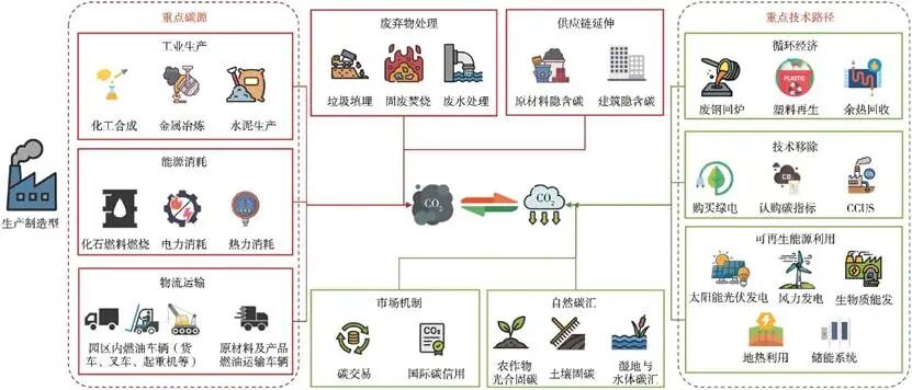 生產(chǎn)制造型園區(qū)通常以高耗能制造業(yè)為主導(dǎo),園區(qū)內(nèi)多為工廠廠房和生產(chǎn)設(shè)施。如圖3所示,其碳排放主要來自工業(yè)生產(chǎn)環(huán)節(jié)(如化工合成、金屬冶煉、水泥生產(chǎn)等,范圍1)、能源消耗環(huán)節(jié)(如煤炭、天然氣等燃料燃燒和電力、熱力使用,范圍1和2),以及物流運輸環(huán)節(jié)(如園區(qū)外燃油運輸車輛等,范圍3)。此類園區(qū)應(yīng)聚焦如下降碳路徑:在物質(zhì)流方面,推廣廢鋼回爐、塑料再生、余熱回收等閉環(huán)工藝,降低原生資源依賴,推動資源循環(huán)利用。能源側(cè)推動太陽能光伏、風(fēng)能、生物質(zhì)和地?zé)岬瓤稍偕茉刺娲鷤鹘y(tǒng)化石燃料,并配套構(gòu)建多能源融合系統(tǒng),以兼顧能源結(jié)構(gòu)優(yōu)化和設(shè)備集成共享。對于其他技術(shù)手段仍難以消除的剩余排放,可以通過購買綠電、認(rèn)購碳指標(biāo)、探索CCUS等方式消除。