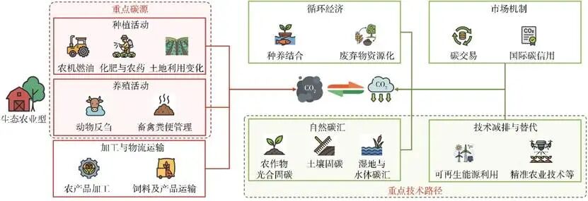 生態(tài)農(nóng)業(yè)型園區(qū)通常位于城鄉(xiāng)結(jié)合部或者郊區(qū),涵蓋現(xiàn)代農(nóng)業(yè)生產(chǎn)、農(nóng)村社區(qū)和生態(tài)保護(hù)功能。如圖5所示,其碳排放主要來自種植活動(如園區(qū)內(nèi)農(nóng)機燃料使用等,范圍1)和養(yǎng)殖活動(如反芻動物腸道發(fā)酵與糞污管理,范圍1)。此類園區(qū)的降碳路徑重點關(guān)注:在農(nóng)業(yè)環(huán)節(jié),推廣精準(zhǔn)農(nóng)業(yè)、低碳耕作、控釋肥與有機肥替代等措施以降低甲烷與氧化亞氮排放;推動生物質(zhì)能替代散煤供熱、農(nóng)光互補等模式,提升清潔能源供給比例,促進(jìn)能源結(jié)構(gòu)清潔化與區(qū)域設(shè)施整合;加強對農(nóng)業(yè)廢棄物和糞污的資源化利用,發(fā)展農(nóng)業(yè)循環(huán)經(jīng)濟(jì)體系,推動資源高效利用。在生態(tài)方面,此類園區(qū)應(yīng)加強森林、草地、水體等自然系統(tǒng)保護(hù)與修復(fù),提升土壤碳匯、濕地碳匯等生態(tài)功能,促進(jìn)多元碳匯在生態(tài)農(nóng)業(yè)型園區(qū)內(nèi)布局。
