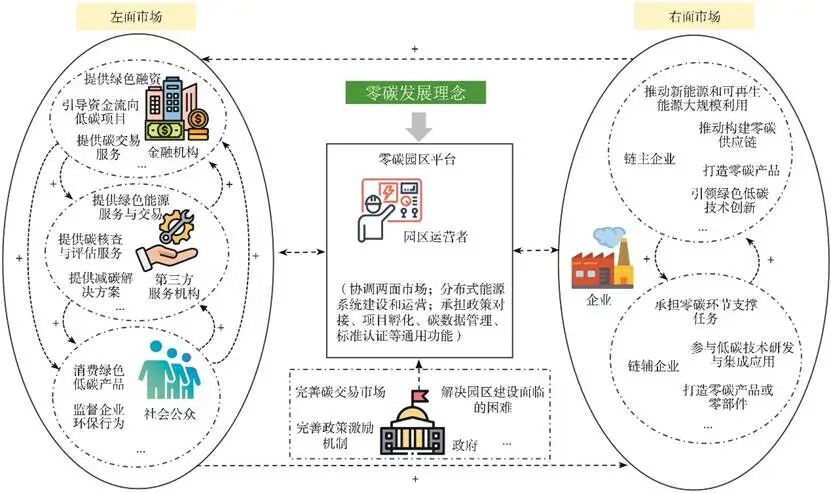 右側(cè)的理念實現(xiàn)市場由鏈主企業(yè)與鏈輔企業(yè)構(gòu)成。鏈主企業(yè)具備資源集聚與系統(tǒng)轉(zhuǎn)型能力,是園區(qū)綠色低碳能源替代、低碳制造升級與綠色供應(yīng)鏈重塑的主導(dǎo)力量,其回報體現(xiàn)為政策激勵、市場占有率提升與品牌聲譽增強。鏈輔企業(yè)則在零碳技術(shù)研發(fā)、零碳產(chǎn)品(零部件)供給和專業(yè)化配套方面發(fā)揮靈活性優(yōu)勢,增強園區(qū)綠色供給的多樣性與適應(yīng)性,進(jìn)而獲得技術(shù)溢出效應(yīng)與新興市場空間。在企業(yè)間協(xié)作方面,鏈主企業(yè)通過共建產(chǎn)業(yè)聯(lián)盟、聯(lián)合技術(shù)攻關(guān)形成協(xié)同引領(lǐng)格局;鏈輔企業(yè)之間則通過共享設(shè)施、互補技術(shù)與聯(lián)合采購提升資源配置效率;鏈主企業(yè)與鏈輔企業(yè)之間通過標(biāo)準(zhǔn)聯(lián)動與產(chǎn)業(yè)鏈協(xié)同推動減排責(zé)任共擔(dān)與創(chuàng)新成果轉(zhuǎn)化,最終構(gòu)建出一個互嵌互動、共生共贏的零碳產(chǎn)業(yè)生態(tài)網(wǎng)絡(luò)。