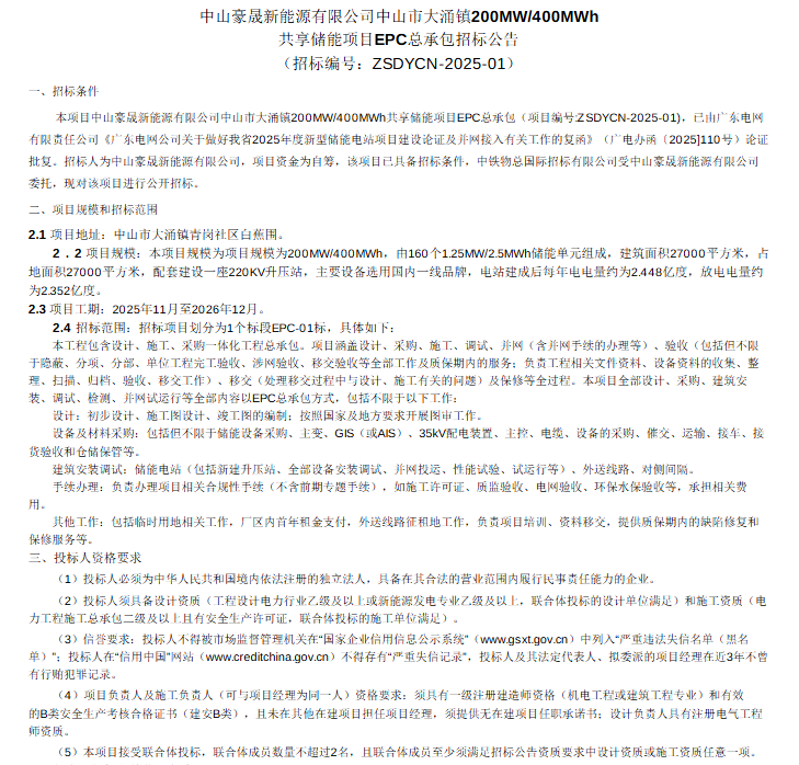 中國儲能網(wǎng)訊:9月2日,中山豪晟新能源有限公司發(fā)布廣東中山市大涌鎮(zhèn)200MW/400MWh共享儲能EPC招標公告,項目位于廣東中山大涌鎮(zhèn),項目資金自籌。