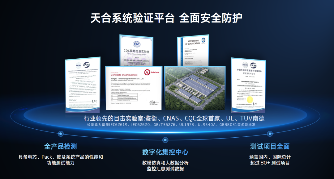 目前,天合儲(chǔ)能已獲得包括鑒衡、TüV南德、UL、CQC等多個(gè)國(guó)際主流認(rèn)證機(jī)構(gòu)的目擊實(shí)驗(yàn)室資質(zhì)。面對(duì)行業(yè)快速發(fā)展,天合儲(chǔ)能精準(zhǔn)捕捉市場(chǎng)革新趨勢(shì)和潛在需求,以卓越的全棧自研技術(shù)能力為客戶創(chuàng)造更高價(jià)值。公司依托嚴(yán)苛的國(guó)際標(biāo)準(zhǔn)對(duì)儲(chǔ)能產(chǎn)品進(jìn)行全生命周期管理,嚴(yán)格滿足全球所有主要市場(chǎng)的安全法規(guī)要求,持續(xù)贏得全球客戶認(rèn)可。