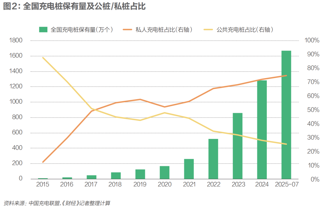充電設(shè)施的普及對電車普及很重要,截至2025年7月,全國1669.6萬個充電樁中,公共樁420.2萬個,私人樁1249.4萬個。