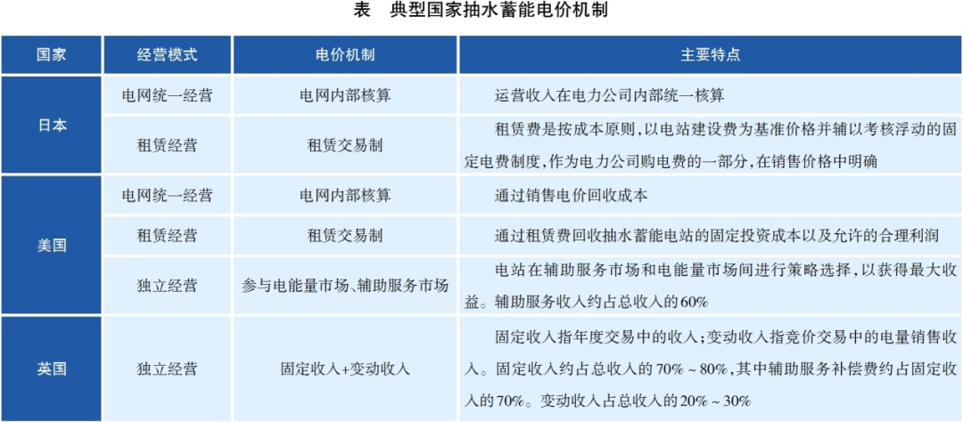 現(xiàn)階段,日本抽水蓄能電站主要采用租賃制(電源開(kāi)發(fā)商參與)和內(nèi)部核算制(電力公司主導(dǎo));美國(guó)則以電網(wǎng)統(tǒng)一運(yùn)營(yíng)模式為主(抽蓄電站約占70%),輔以租賃運(yùn)營(yíng)和少量獨(dú)立運(yùn)營(yíng),直接參與電力市場(chǎng)的比例較低;英國(guó)抽水蓄能電站雖然總體規(guī)模有限,但其高度市場(chǎng)化的發(fā)電側(cè)環(huán)境使其能夠作為獨(dú)立成員參與市場(chǎng),其收入明確區(qū)分為年度交易的固定收入與競(jìng)價(jià)交易的變動(dòng)收入兩部分,構(gòu)成典型的兩部制電價(jià)模式(見(jiàn)表)。