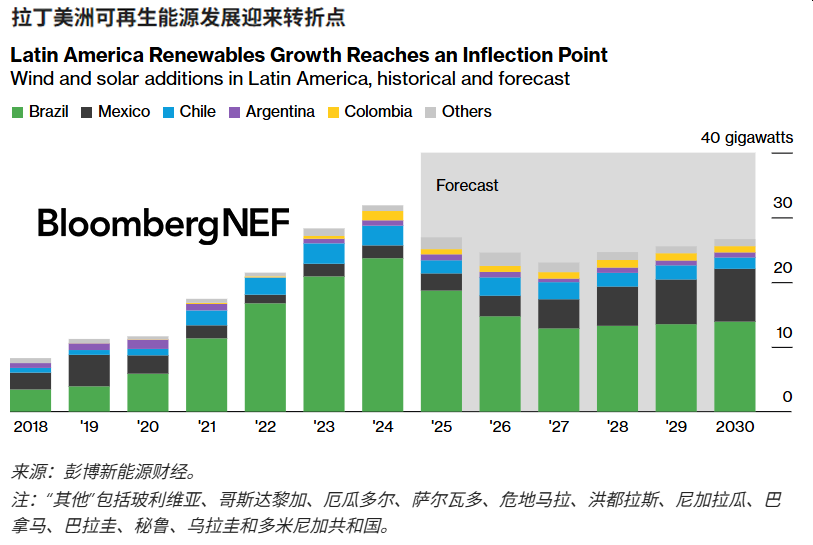 拉丁美洲清潔電力新增裝機可能已在2024年達(dá)峰。電力供應(yīng)過剩、高棄電率及輸電瓶頸預(yù)計將終結(jié)該地區(qū)自2018年以來風(fēng)電和光伏新增裝機加速增長的態(tài)勢。盡管能源領(lǐng)域改革與裝機容量競價顯示今年存在結(jié)構(gòu)性變化,但預(yù)計復(fù)蘇要到2028年才顯現(xiàn)。
