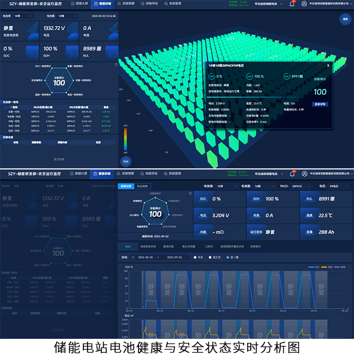針對(duì)中石油儲(chǔ)能場(chǎng)站普遍位于偏遠(yuǎn)、無(wú)人值守區(qū)域的工況特點(diǎn),深圳院安全監(jiān)測(cè)裝備采用高效、穩(wěn)定且輕量化的邊緣計(jì)算架構(gòu),支持現(xiàn)場(chǎng)快速安裝、云端遠(yuǎn)程調(diào)試與運(yùn)維,降低部署難度及后期維護(hù)成本。裝備集成機(jī)理模型與數(shù)據(jù)表征雙路徑算法,可實(shí)時(shí)評(píng)估單體及群體電池的老化速率、老化拐點(diǎn)及剩余壽命,拓寬電池的可用邊界;同時(shí),依據(jù)模組、電池簇的一致性趨勢(shì),配合深圳院自研的全電流控制主動(dòng)均衡技術(shù),保障系統(tǒng)在全壽命周期內(nèi)維持設(shè)計(jì)性能。基于多維度健康診斷和熱失控隱患分析,平臺(tái)將潛在風(fēng)險(xiǎn)提前暴露并分級(jí)預(yù)警,運(yùn)維團(tuán)隊(duì)可按優(yōu)先級(jí)遠(yuǎn)程處置。前期運(yùn)行數(shù)據(jù)表明,裝備投運(yùn)后,儲(chǔ)能電站可實(shí)現(xiàn)無(wú)人化、精細(xì)化、自主化的高質(zhì)量運(yùn)維值守。達(dá)到以下效果: