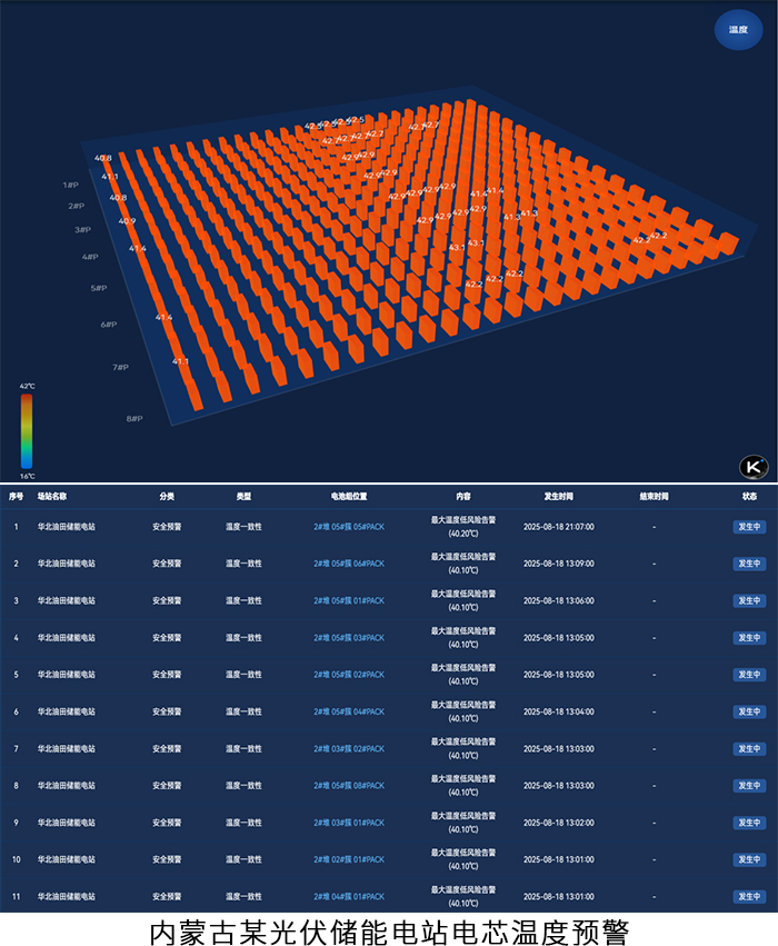 險(xiǎn)情捕捉:8月18日23時(shí),內(nèi)蒙古阿拉善盟某光伏儲(chǔ)能站突現(xiàn)險(xiǎn)情:因散熱系統(tǒng)失效,電芯溫度在充放電循環(huán)中由25℃驟升至 40℃以上,且各電池簇溫度同步逼近臨界紅線。儲(chǔ)能安全監(jiān)測(cè)裝備即時(shí)捕捉異常,連發(fā)預(yù)警,精準(zhǔn)鎖定熱失控前兆,成功阻斷了即將蔓延的火情,化危于無(wú)形,為業(yè)主挽回了近500萬(wàn)元的儲(chǔ)能資產(chǎn)。