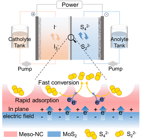 基于此,陳嘉嘉教授課題組設計出一種具有三明治狀納米結構的二維有序介孔氮摻雜碳復合二硫化鉬(Meso-NC@MoS2)異質(zhì)結,以促進多硫化物的吸附并加速其緩慢的動力學。理論計算證實,MoS2和Meso-NC之間建立的定向電子傳輸通道加速了電子從Meso-NC@MoS2向S42-的轉(zhuǎn)移,有效促進S42-解離并形成低階多硫化物。基礎電化學測試表明,在Meso-NC@MoS2電極上,水系多硫化物展現(xiàn)出最大反應動力學活性(反應速率常數(shù)提升3.2倍)與最小峰電位差(ΔEp降低至0.21 V),突顯了卓越的催化活性與反應可逆性。相較于純碳氈電極,基于Meso-NC@MoS2的水系多硫化物液流電池充電過電位顯著降低約377 mV,并有效削弱電池極化。該電池在30天內(nèi)連續(xù)運行3200次循環(huán)后,仍保持112 mW cm-2的峰值功率密度及99.9%的庫倫效率。