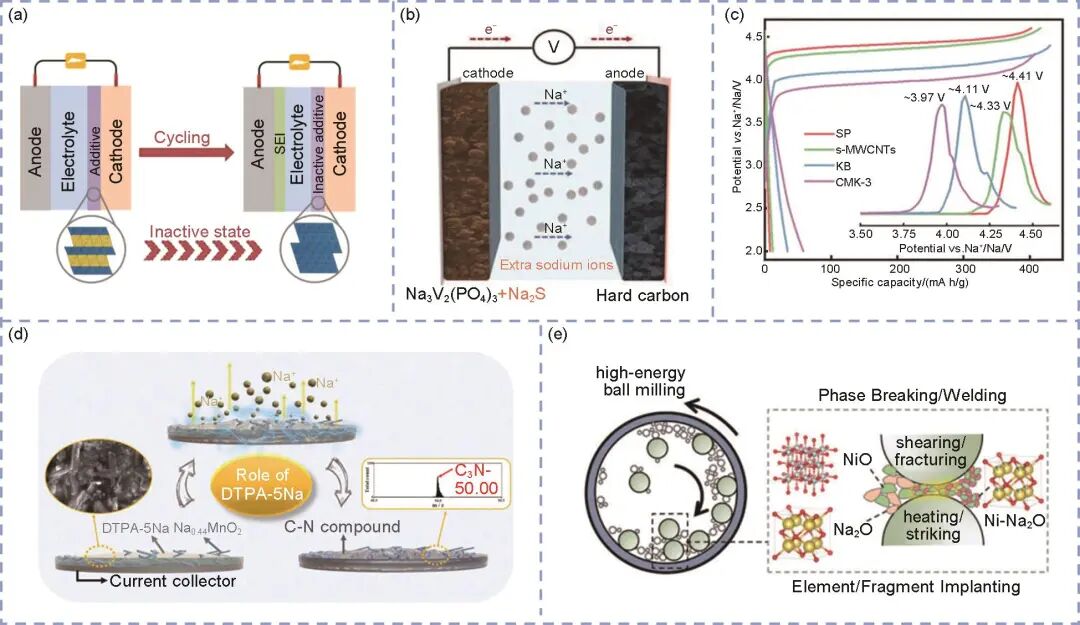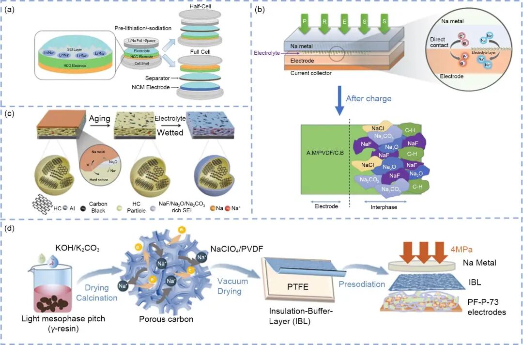 全球氣候持續(xù)惡化和化石能源日益枯竭的雙重挑戰(zhàn),促進(jìn)太陽能和風(fēng)能等新能源迅速崛起為能源轉(zhuǎn)型的核心方向。然而,新能源固有的間接性和波動(dòng)性特征,決定了其必須依賴儲(chǔ)能器件實(shí)現(xiàn)電網(wǎng)消納,特別是在應(yīng)對(duì)短時(shí)高頻高功率波動(dòng)(如秒級(jí)風(fēng)光出力突變)和調(diào)頻調(diào)峰需求時(shí),更需要兼具高功率密度與快速響應(yīng)(毫秒級(jí))能力的儲(chǔ)能系統(tǒng),因此發(fā)展高效儲(chǔ)能技術(shù)已成為能源轉(zhuǎn)型中亟待突破的關(guān)鍵瓶頸。在眾多的儲(chǔ)能器件中,鋰離子電池(LIB)憑借高能量密度和長(zhǎng)循環(huán)壽命的優(yōu)勢(shì)而備受關(guān)注,然而,鋰資源的地殼豐度低(約20 mg/kg)與地理分布不均等固有問題,嚴(yán)重制約了其在大規(guī)模儲(chǔ)能和高功率場(chǎng)景中的可持續(xù)發(fā)展。相比之下,鈉資源的地殼豐度(約23600 mg/kg)比鋰高三個(gè)數(shù)量級(jí),且具有供應(yīng)穩(wěn)定與成本低廉的優(yōu)勢(shì),這使得鈉離子電池(SIB)成為鋰電儲(chǔ)能系統(tǒng)的戰(zhàn)略性補(bǔ)充方案。此外,鈉離子電池主要采用硬碳負(fù)極,具有優(yōu)異的低溫和快充性能,在短時(shí)高頻充放電領(lǐng)域展現(xiàn)出獨(dú)特潛力。盡管鋰和鈉同屬堿金屬主族且共享相似的還原電位,但鈉離子的較大半徑(1.02 ? vs. Li+ 0.76 ?)導(dǎo)致其在宿主材料中的擴(kuò)散能壘升高,從而顯著限制了適用于鈉離子電池的正負(fù)極材料選擇范圍。當(dāng)前,鈉離子電池的電極材料體系主要包含:正極材料——層狀氧化物(如Na?MO2)、聚陰離子化合物[如Na3V2(PO4)3]及普魯士藍(lán)類似物(如NaMnHCF);負(fù)極材料——硬碳、合金(如Sn基)及轉(zhuǎn)化型材料(如FeS2)。這些材料通過晶體結(jié)構(gòu)調(diào)控與界面優(yōu)化,已實(shí)現(xiàn)>300 mAh/g的儲(chǔ)鈉比容量及>90%的循環(huán)容量保持率(1000次循環(huán))。隨著電動(dòng)汽車市場(chǎng)滲透率的快速增長(zhǎng),續(xù)航里程焦慮和高功率響應(yīng)要求的持續(xù)加劇,推動(dòng)高能量密度、高功率密度電池發(fā)展成為動(dòng)力電池領(lǐng)域的核心攻關(guān)目標(biāo)。為此,研究者已提出多尺度協(xié)同優(yōu)化策略,包括正極材料體相摻雜(如Ti/Mg共摻雜)、負(fù)極表面包覆(如碳層修飾)及電解質(zhì)組分調(diào)控(如高濃度電解液),以期通過離子傳輸動(dòng)力學(xué)與界面穩(wěn)定性的同步提升實(shí)現(xiàn)能量密度突破。然而,首圈化成過程中負(fù)極表面SEI膜的不可控生長(zhǎng)會(huì)不可逆消耗大量活性鈉,致使電池初始庫侖效率(ICE)普遍低于80%,這一關(guān)鍵瓶頸嚴(yán)重限制了電極材料理論能量密度的實(shí)現(xiàn),亟需通過預(yù)鈉化技術(shù)補(bǔ)償活性鈉損失。