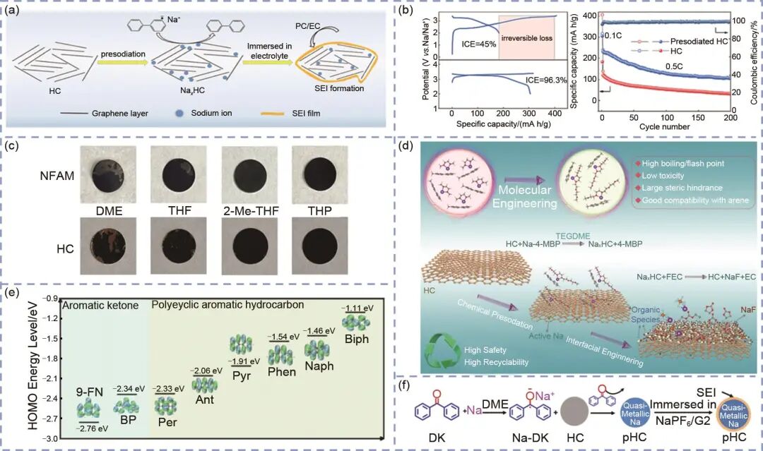 圖6 液態(tài)還原型材料:(a) Na-Biph/DME對(duì)HC預(yù)鈉化示意圖;(b) 預(yù)鈉化前后HC性能;(c) 不同試劑處理NFAM和HC極片后的圖片;(d) Na-Biph/TEGDME對(duì)HC預(yù)鈉化示意圖;(e) 各種芳香化合物的HOMO能級(jí)與其氧化還原電位對(duì)比圖;(f) Na-DK對(duì)HC的預(yù)鈉化過程示意圖