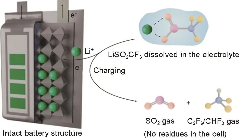 截至目前,采用氧化型液體的預(yù)鈉化技術(shù)領(lǐng)域尚處于空白,未見相關(guān)研究報(bào)道。與之形成對(duì)比的是,在鋰電池研究體系中,針對(duì)類似技術(shù)路徑已有一定探索成果。Chen等人提出一種創(chuàng)新策略,旨在通過外部鋰供應(yīng)解決電池鋰不足與壽命受限問題。研究團(tuán)隊(duì)篩選出有機(jī)鋰鹽(LiSO2CF3),將其溶解于電解液中,如圖8所示。在充電過程中,該有機(jī)鋰鹽分解并釋放鋰離子,同時(shí)排出無害氣體。通過向電池注入含有LiSO2CF3的電解液,可實(shí)現(xiàn)多次補(bǔ)鋰。實(shí)驗(yàn)結(jié)果顯示,商用LiFePO4電池在經(jīng)歷11818次循環(huán)后,容量保持率達(dá)96%;針對(duì)鋰缺乏的正極材料,如Cr8O21和硫化聚丙烯腈,電池的能量密度分別達(dá)到1192 Wh/kg和388 Wh/kg。本研究為在鈉離子電池中實(shí)現(xiàn)氧化型液體預(yù)鈉化技術(shù)奠定了理論基礎(chǔ)。Na+的溶劑化能力較弱,相同陰離子的鈉鹽氧化電位通常比鋰鹽低0.2~0.3 V,這擴(kuò)大了鈉離子電池中液態(tài)氧化型材料的選擇范圍。通過合理的篩選NaSO2CF3有望成為合適鈉離子體系的液態(tài)氧化型材料。但是NaF溶解度高于LiF,Na2S易溶于電解液,可能會(huì)導(dǎo)致形成的SEI保護(hù)性不佳,NaSO2CF3的補(bǔ)鈉效果可能較差,未來研究可以考慮引入含硼或含磷陰離子,形成致密的SEI,得到更穩(wěn)定的鈉鹽。