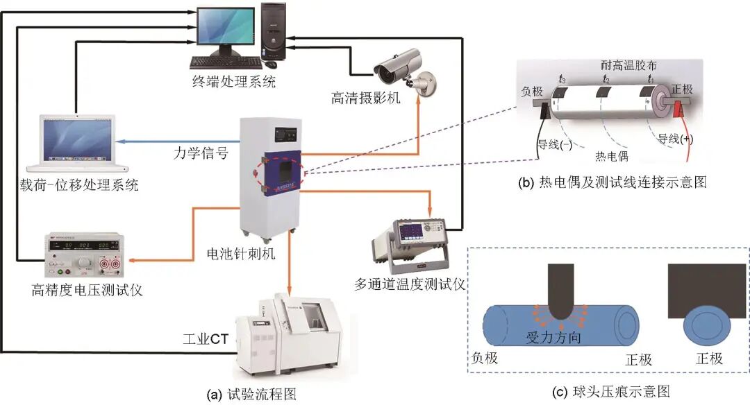 選擇深圳三思縱橫科技股份有限公司生產(chǎn)的suns縱橫風(fēng)暴系列的電子萬能試驗機作為球頭壓痕試驗機器,選用直徑為1 mm的抗高溫球頭對電池進行擠壓,利用載荷-位移處理系統(tǒng)控制球頭進程并實時輸出載荷數(shù)值,搭配多通道溫度測試儀、高精度電壓測試儀、高清攝像頭等實驗儀器記錄相關(guān)現(xiàn)象與數(shù)據(jù),利用CT技術(shù)對壓痕過程進行全程動態(tài)跟蹤掃描,分析電池的內(nèi)部變形與結(jié)構(gòu)損傷,借助SEM技術(shù)剖析正負電極的微觀形貌變化,探究壓痕內(nèi)短路發(fā)生機理。