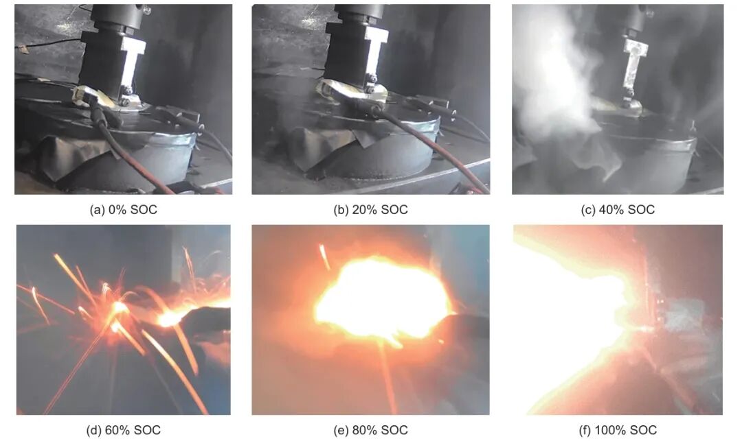 在碰撞事故中,電池會受到不同方向和程度的傷害。電池包的框架受到膨脹和擠壓,可能會對電池造成球壓的現(xiàn)象,從而觸發(fā)內(nèi)短路機制。為探究不同SOC下電池的安全特征,以1 mm/min的速度對0%、20%、40%、60%、80%和100% SOC的鋰離子電池進行壓痕試驗,且達到9 mm壓痕停止工作。試驗結(jié)果如圖2所示,當(dāng)SOC為0%、20%時,電池僅出現(xiàn)電解液外流,見圖2(a)、(b),SOC為40%時,出現(xiàn)淡煙,伴有刺激性氣體產(chǎn)出,電解液外流現(xiàn)象更嚴(yán)重,見圖2(c),以上測試樣品均未發(fā)生熱失控。SOC為60%時,正極側(cè)、負極側(cè)出現(xiàn)大量濃煙,安全閥被打開,正極側(cè)噴射火花,隨之負極側(cè)也噴射火花,最終電池多區(qū)域同時發(fā)生火花噴射現(xiàn)象,見圖2(d),電池發(fā)生熱失控。SOC為80%和100%時,火花噴射現(xiàn)象后,電池持續(xù)燃燒約7 s,熱失控現(xiàn)象進一步加劇,見圖2(e)、(f)。