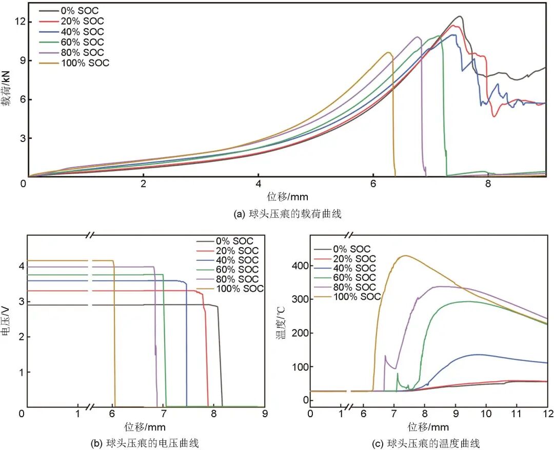 為明確球壓過程中的各個階段及相應(yīng)的特征,探究全域機械負載下的圓柱型電池力-電-熱耦合響應(yīng),確定電池在不同SOC下的球頭壓痕特性。圖3(a)為不同SOC電池球頭壓痕實驗電壓及載荷變化數(shù)據(jù),可見壓縮深度為0~4 mm時,載荷緩慢上升,電芯在4 mm壓縮深度時被壓實,4 mm壓縮深度后,載荷急速上升,達到峰值載荷后發(fā)生內(nèi)短路現(xiàn)象。未熱失控電池載荷驟降至5~8 kN,熱失控電池載荷驟降至0 N。0% SOC電池的內(nèi)短路壓痕位移為7.50 mm,100% SOC電池的壓痕位移為6.26 mm,表明SOC越高,電池越容易發(fā)生內(nèi)短路。峰值載荷值隨著SOC的增大而減小,0% SOC電池的峰值載荷為12.41 kN,100% SOC電池為9.62 kN。這是因為球頭壓痕實驗在電池的局部位置施加載荷,極片和隔膜受到軸向和縱向雙重壓力(圖1),鋰離子嵌入負極形成穩(wěn)定結(jié)構(gòu),對徑向受力起“抵抗”作用,電極軸向受力使得電池出現(xiàn)剪切力破壞導(dǎo)致隔膜的損壞,進而引發(fā)電芯電極出現(xiàn)斷裂帶,誘發(fā)了更劇烈的內(nèi)短路行為,產(chǎn)生局部短路電流。短路電流通過極耳從初始的電極對傳輸?shù)蕉搪冯姌O對形成回路,電池短路帶呈現(xiàn)兩端蔓延現(xiàn)象。