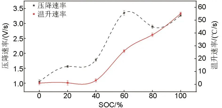 圖3(b)所示為電壓變化曲線,球頭壓痕電池的軟短路與硬短路同時發(fā)生,未熱失控電池在內(nèi)短路發(fā)生前會有0.1~0.2 mm階段的電壓小幅下降,即為軟短路,隨后電壓驟降至0 V,即為硬短路。這是因為電解液揮發(fā)導(dǎo)致濃度減小,導(dǎo)電能力下降,正負極離子運動減緩,電壓出現(xiàn)小幅下降。圖3(c)所示為溫度變化曲線,未熱失控電池峰值溫度位于中部初始內(nèi)短路點,熱失控電池的峰值溫度位于正極,溫升速度隨著SOC的增加而增大。0%、20% SOC壓痕電池的峰值溫度為50 ℃左右,40% SOC電池峰值溫度為135.1 ℃,此溫度下固體電解質(zhì)界面(solid electrolyte interphase,SEI)膜發(fā)生小幅度的分解,電池處于不穩(wěn)定狀態(tài)。SOC≥60%時,壓痕電池的峰值溫度超過250 ℃。值得注意的是,SOC為60%和80%時,壓痕試驗電池溫度出現(xiàn)小幅升高-下降-大幅升高現(xiàn)象。這是因為變形區(qū)域從相對局域化擴展到整個電池,發(fā)生局部內(nèi)短路后會出現(xiàn)短路蔓延現(xiàn)象,全域內(nèi)短路釋放的能量使得電池溫度大幅升高。SOC為100%時,局域化的加載會引發(fā)一系列的局部損傷,電池中部內(nèi)短路釋放大量能量,燃燒現(xiàn)象使得溫度在短時間內(nèi)升至峰值。