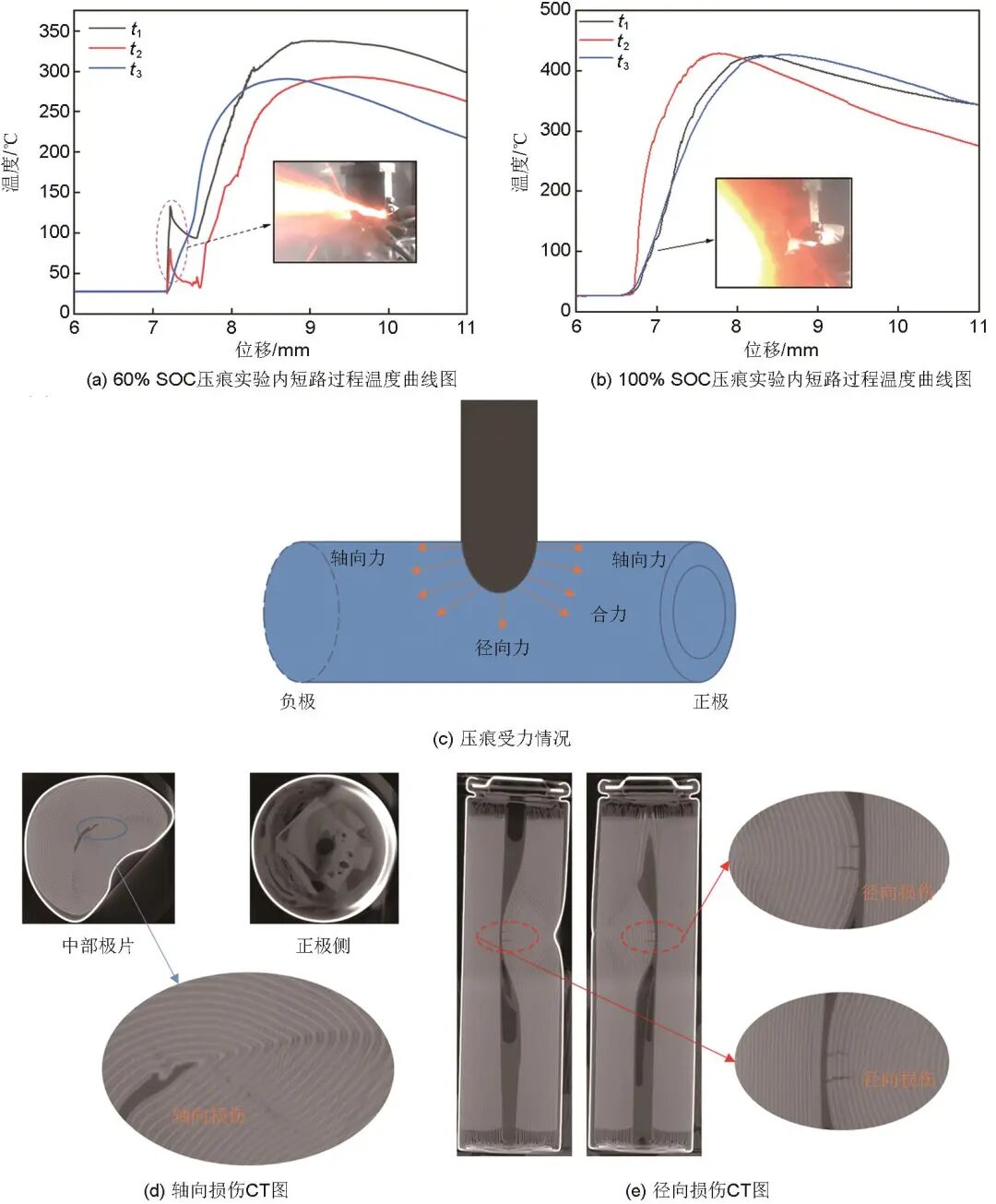 如圖5(c)所示,在球頭壓痕試驗中,球頭施加到電池表面的載荷方向與接觸面垂直。隨著壓痕深度的增加,電芯受到徑向與軸向的壓力,兩種不同的作用力對極片的破壞形式不同,徑向力對極片與隔膜強度產(chǎn)生破壞,軸向力主要對電極產(chǎn)生剪切破壞,兩種力同時對電池產(chǎn)生作用效果。從圖5(d)中可知,內(nèi)短路發(fā)生前期,中部極片出現(xiàn)層間裂紋,安全閥出現(xiàn)結(jié)構(gòu)性破壞,被壓兩側(cè)均有極片裂紋,局部電極破壞形式較多,內(nèi)短路發(fā)生后溫度驟升??傮w來說,在初始壓痕過程中,電池內(nèi)部結(jié)構(gòu)由于擠壓產(chǎn)生較大壓力,內(nèi)部氣壓在正極側(cè)、中部、負極側(cè)大量積聚至內(nèi)短路產(chǎn)生。電池正負極處均出現(xiàn)破裂,極片和隔膜從正負極位置向外突出,中部壓痕區(qū)域?qū)娱g破壞顯著,銅箔、鋁箔形貌均遭受較大損壞,出現(xiàn)局部屈曲彎折變形。斷裂帶沿著縱向擴展的深度有限,且某些位置的極片排列較為齊整。由此可見,壓痕引起的熱失控是局部內(nèi)短路擴展蔓延的結(jié)果。