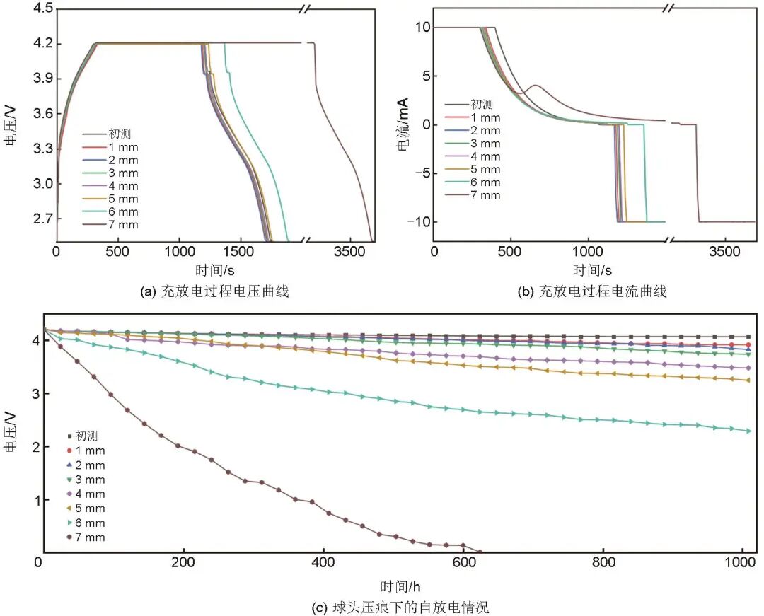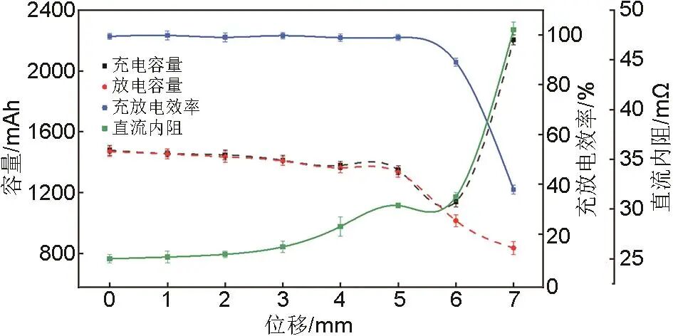 (4)壓痕狀態(tài)下的電化學(xué)性質(zhì)探究中,雖然不同壓痕深度電池恒流充電容量近乎相同,但恒流放電容量隨著壓痕深度增加而逐漸降低。在壓痕深度為5 mm之前,容量衰減趨勢接近線性,超過6 mm之后大幅下降,這是因為更多的短路電極對影響電池容量。