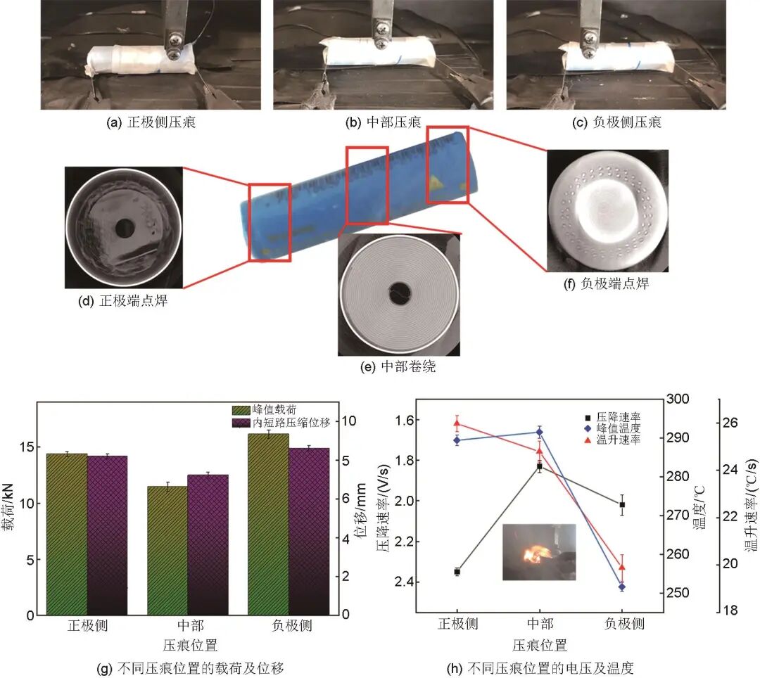 電池正極側(cè)、中部、負極側(cè)結(jié)構(gòu)有所不同,因此球頭壓痕過程中,壓痕位置不同,實驗效果也會有所不同。選擇60% SOC 18650電容型鋰離子電池,補充對電池正極側(cè)與負極側(cè)的球頭壓痕實驗,如圖6(a)~(c)所示。正負極兩端與外殼所構(gòu)成的結(jié)構(gòu)完整性更強,見圖6(d)、(f),承載能力也就越強。而電池外殼中部與電芯層之間存在間隙,見圖6(e),受力較薄弱。圖6(g)展示了不同壓痕位置造成的峰值載荷及失效位移。正極側(cè)、中部、負極側(cè)位置峰值載荷分別為14.36 kN、11.44 kN、16.14 kN,中部壓痕載荷值小于兩側(cè)位置,負極側(cè)峰值載荷最大。內(nèi)短路時的壓痕位移也呈現(xiàn)同樣的變化規(guī)律,如圖6(h)所示,正極側(cè)壓降速率更大,更容易發(fā)生內(nèi)短路,這是因為正極結(jié)構(gòu)易發(fā)生損壞,且靠近安全閥;中部位置峰值溫度最高,這是因為內(nèi)短路發(fā)生在電芯中部,溫度蔓延效應(yīng)的導(dǎo)致兩側(cè)溫度升高,可燃燒活性物質(zhì)更多,燃燒更加充分。正極側(cè)位置溫升速度更大,這是因為正極離火花噴射點位置更近。綜上可知,正極側(cè)位置的球頭壓痕更易發(fā)生內(nèi)短路現(xiàn)象,對電池的整體破壞更強。