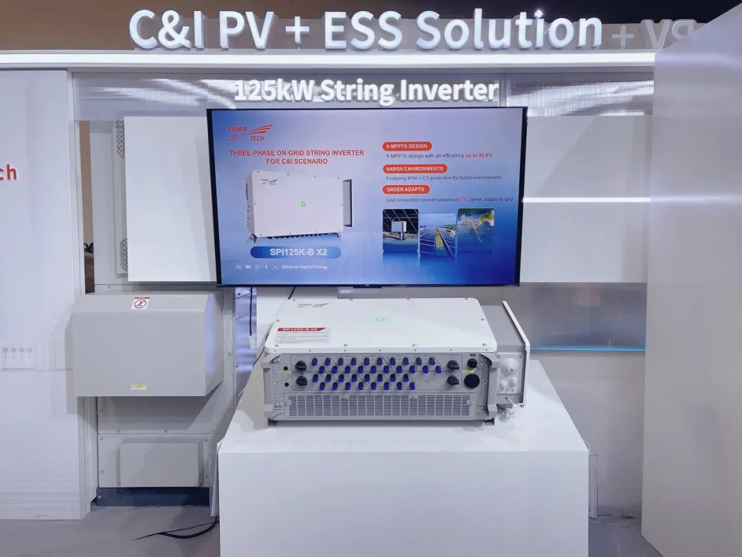 在光伏方面,科華數(shù)能本次重點(diǎn)展示了125kW組串式逆變器。該產(chǎn)品單路MPPT最高支持75A,配備直流/交流端子溫度智能監(jiān)測(cè)與自動(dòng)化PV側(cè)停機(jī)功能,可選IV曲線分析與故障波形記錄,助力快速定位問(wèn)題、預(yù)防維護(hù)。產(chǎn)品最高效率達(dá)98.8%,具備IP66+C5防護(hù)與低諧波并網(wǎng)表現(xiàn),可在寬溫環(huán)境下穩(wěn)定輸出。