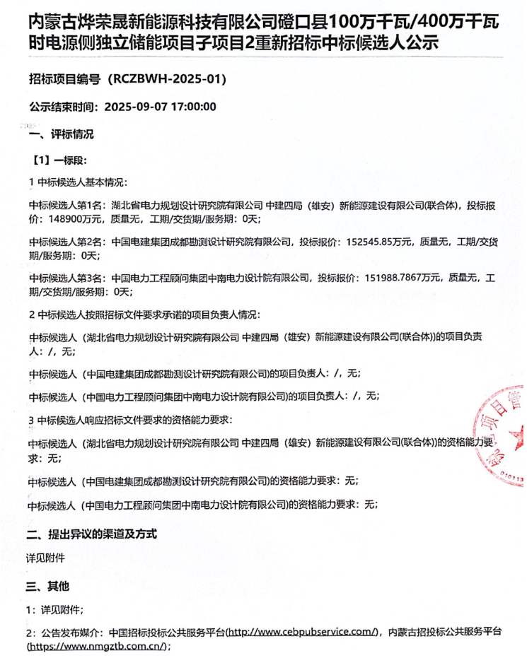 中國儲(chǔ)能網(wǎng)訊:9月5日,內(nèi)蒙古燁榮晟新能源科技有限公司磴口縣100萬千瓦/400萬千瓦時(shí)電源側(cè)獨(dú)立儲(chǔ)能項(xiàng)目子項(xiàng)目2重新招標(biāo)中標(biāo)候選人公示發(fā)布。