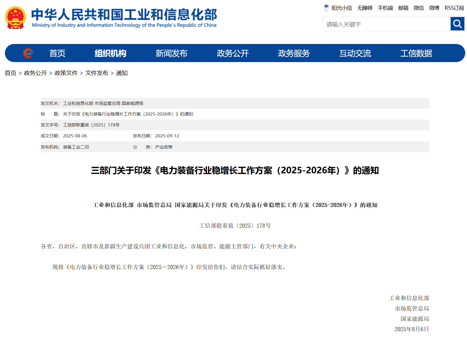 中國儲(chǔ)能網(wǎng)訊:9月12日,工業(yè)和信息化部、市場(chǎng)監(jiān)管總局、國家能源局聯(lián)合印發(fā)《電力裝備行業(yè)穩(wěn)增長(zhǎng)工作方案(2025-2026年)》。