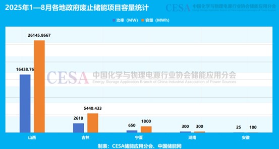 在2025年1—8月各地政府廢止的儲能項目中,山西省以16438.76MW/26145.8667MWh的規(guī)模居首,占全國總功率的83.3%、總?cè)萘康?8.1%,成為廢止規(guī)模最大的省份;吉林省以2618MW/5440.43MWh緊隨其后,占比13.3%/16.2%;寧夏、湖南、安徽三地合計占比3.4%/5.7%。