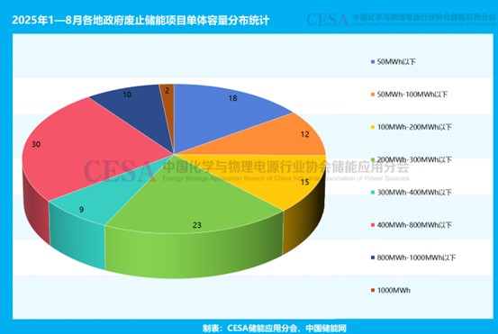 從項目單體容量來看,400MWh—800MWh區(qū)間成為廢止項目最集中的區(qū)間,達30個,占總量的25.21%。該區(qū)間項目多為大型電網(wǎng)側(cè)儲能電站或新能源配套儲能設(shè)施,其高占比可能與早期規(guī)劃規(guī)模偏大、實際運營效率不及預(yù)期有關(guān)。