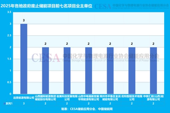 具體到項目業(yè)主來看,2025年1—8月各地政府廢止儲能項目共涉及119家業(yè)主企業(yè),其中前七名項目業(yè)主單位廢止項目數(shù)量突出。遠景能源有限公司以3個項目居首,成為廢止項目最多的企業(yè);山西國際能源集團儲能股份有限公司、俊美科技發(fā)展有限公司、山西華電福新發(fā)展華朔能源有限公司、朔州市平魯區(qū)金潤儲能有限公司、優(yōu)構(gòu)智能技術(shù)有限公司、中核匯能(山西)能源有限公司六家企業(yè)各廢止2個項目。