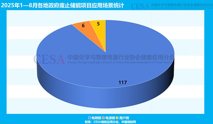 2025年1—8月,全國128個政府廢止儲能項目中電網(wǎng)側(cè)廢止項目117個,數(shù)量占比高達91.4%,電源側(cè)廢止項目6個,數(shù)量占比4.7%,用戶側(cè)廢止項目5個,數(shù)量占比3.9%,反映當前儲能項目規(guī)劃與實施中的深層矛盾。