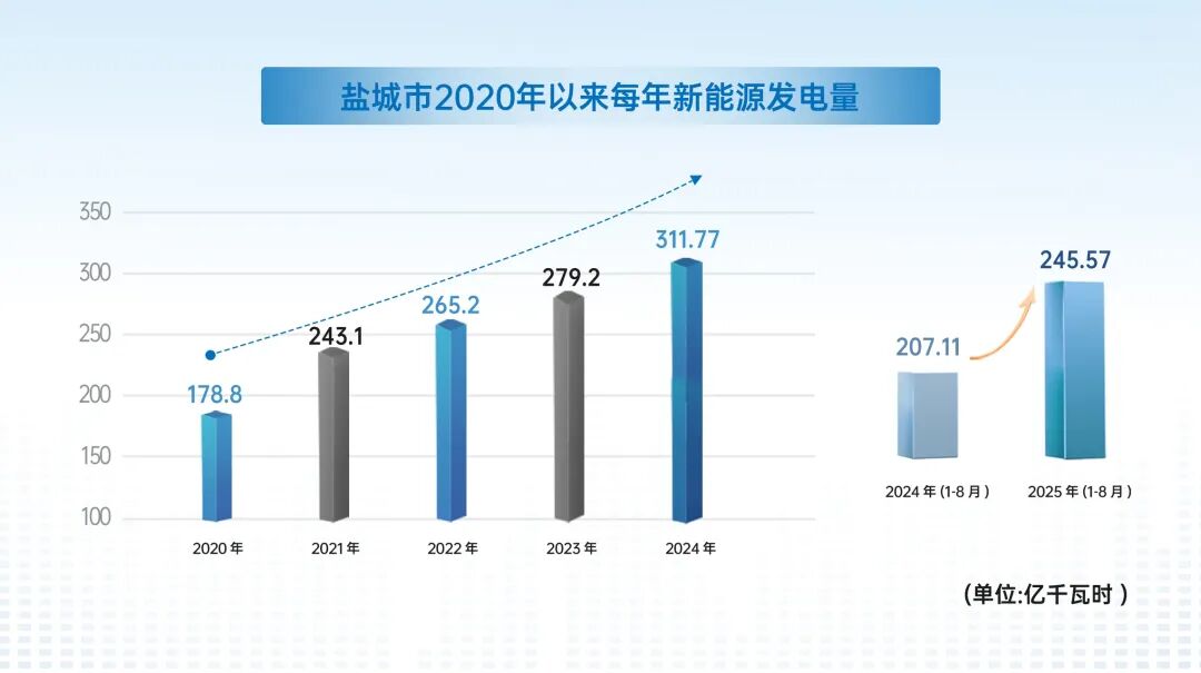 截至今年8月底,鹽城新能源年發(fā)電量已達245.5億千瓦時,預計今年鹽城新能源全年發(fā)電量將突破400億千瓦時。按照全國每人每年平均用電1000千瓦時測算,鹽城新能源全年發(fā)電量相當于4000萬人一年的用電量,與越南全國新能源(不包括水電)發(fā)電水平相當。