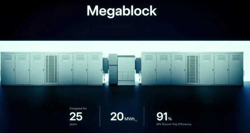 Megablock則是由4個(gè)Megapack 3與高壓變壓器、開(kāi)關(guān)設(shè)備組裝而成,能量達(dá)到20MWh,中壓側(cè)能量效率達(dá)到91%,使用壽命25年,循環(huán)次數(shù)超過(guò)10,000次,面積能量密度為每英畝248 MWh。