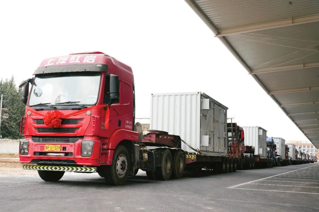 同一時(shí)刻,另一場(chǎng)“能源接力”也正在上演。河北科力遠(yuǎn)保定工廠啟動(dòng)了200MWh儲(chǔ)能系統(tǒng)產(chǎn)品交付工作。隨著指令下達(dá),起重機(jī)將大型儲(chǔ)能柜吊裝至重型卡車(chē)上。中午13點(diǎn)18分,在河北科力遠(yuǎn)總經(jīng)理賈文杰及公司員工的共同注視下,一輛輛滿載儲(chǔ)能柜的卡車(chē)組成“能源長(zhǎng)龍”,正式奔赴山東臨沂的羅莊獨(dú)立儲(chǔ)能電站項(xiàng)目。