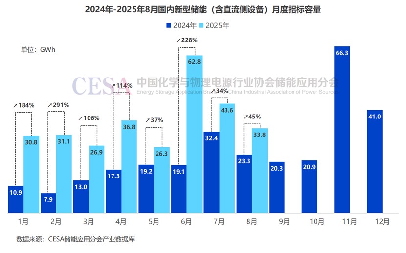 2025年1-8月,儲(chǔ)能新增采招落地規(guī)模達(dá)302.8GWh,同比增長(zhǎng)203%。