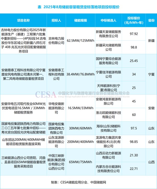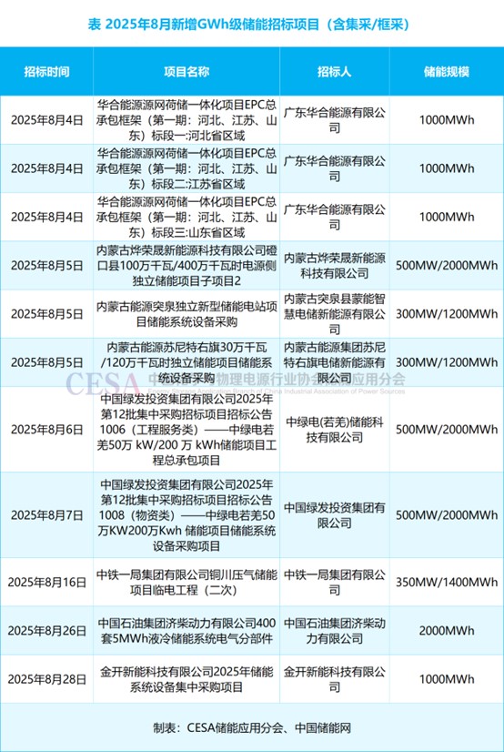 2025年8月,多個(gè)GWh級(jí)項(xiàng)目啟動(dòng)招標(biāo),主要分布在內(nèi)蒙古、新疆、河北、江蘇、山東、陜西等地。