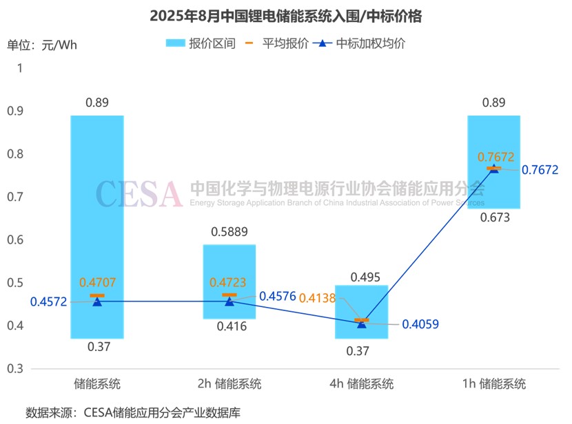 2025年8月,1h鋰電儲(chǔ)能系統(tǒng)入圍報(bào)價(jià)主要集中在0.673-0.89元/Wh區(qū)間內(nèi),平均報(bào)價(jià)0.7672元/Wh。