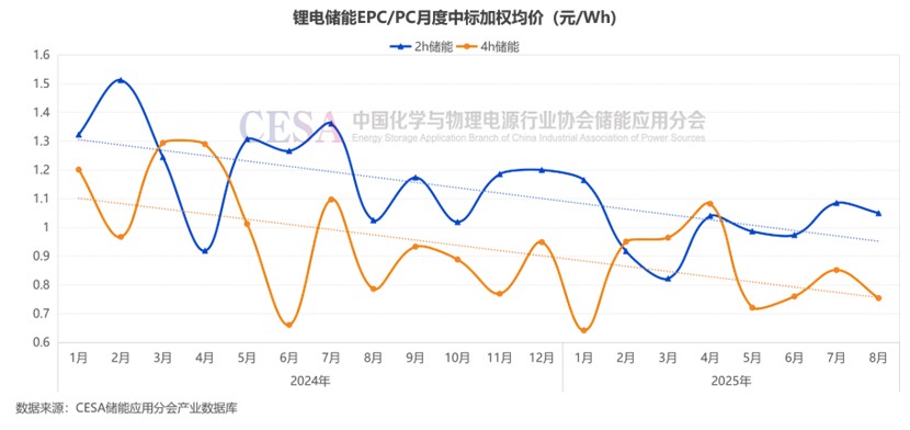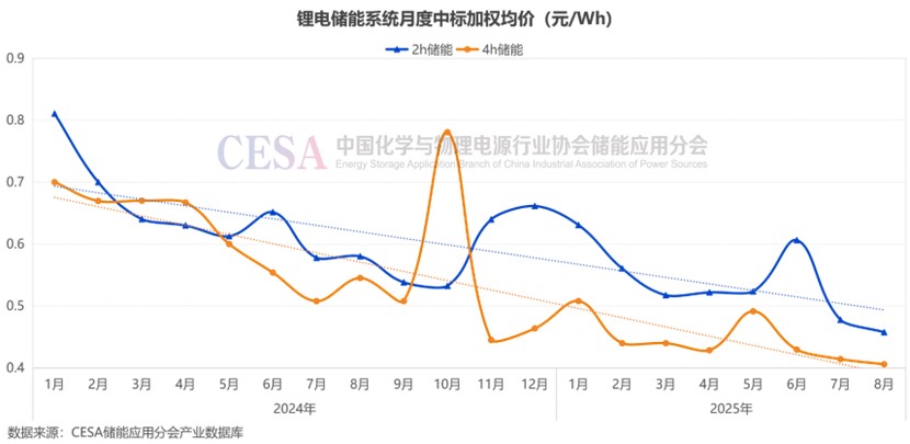 可以看出,2025年8月,2h和4h鋰電儲(chǔ)能系統(tǒng)中標(biāo)均價(jià)、最低報(bào)價(jià)雙雙創(chuàng)歷史新低。