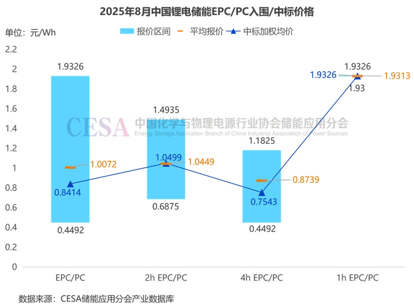 據(jù)CESA儲(chǔ)能應(yīng)用分會(huì)不完全統(tǒng)計(jì),2025年8月,鋰電儲(chǔ)能EPC/PC(不含工商業(yè)儲(chǔ)能柜EPC)入圍報(bào)價(jià)主要集中在0.4492-1.9326元/Wh范圍內(nèi),平均報(bào)價(jià)1.0072元/Wh,中標(biāo)加權(quán)均價(jià)0.8414元/Wh,環(huán)比-14.02%,創(chuàng)鋰電儲(chǔ)能EPC/PC中標(biāo)均價(jià)新低。