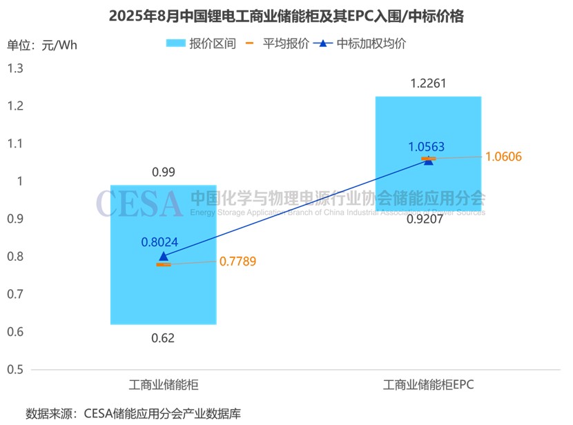 2025年8月,國(guó)內(nèi)鋰電工商業(yè)儲(chǔ)能柜EPC入圍報(bào)價(jià)主要集中在0.9207-1.2261元/Wh區(qū)間內(nèi),平均報(bào)價(jià)1.0606元/Wh,中標(biāo)加權(quán)均價(jià)1.0563元/Wh。