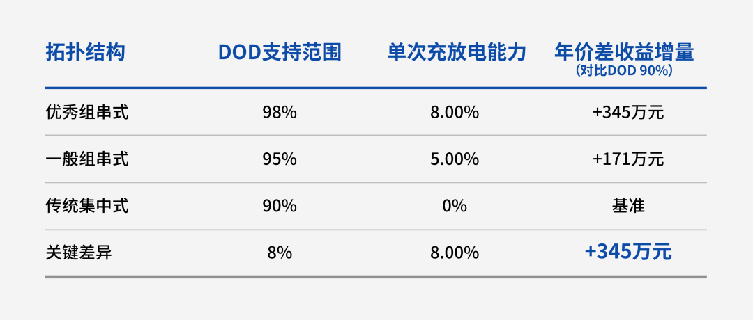系統(tǒng)拓撲結構決定了電池簇的能量分配方式,合理的拓撲設計可避免簇間環(huán)流,避免局部電芯過充過放,從而支撐更高 DOD,例如:傳統(tǒng)集中式拓撲,多簇直流并聯(lián),為避免充放電末端電池簇間環(huán)流導致的電池過充或過放問題,充放電范圍設置為5%~95%,DOD=90%; 而組串式拓撲,單簇單管理,獨立交流輸出,無簇間環(huán)流,配置合理的保護機制,DOD可以做到98%以上,并且不影響電池衰減。